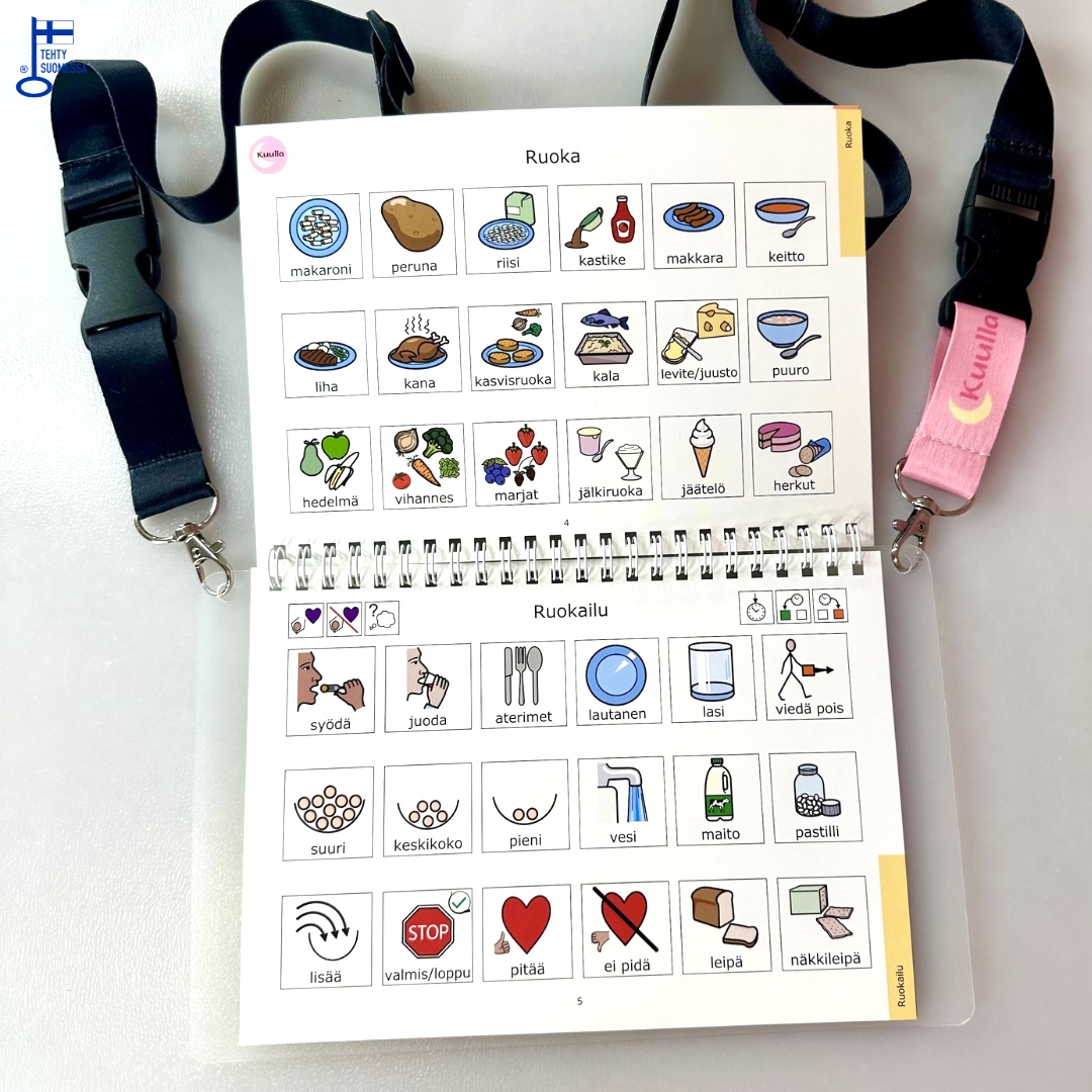 - Teemat: ohjeet ja viestit, päivän struktuuri ja toiminnot, ruokailu, leikit, ulkoilu, pukeminen, tehtävät, värit ja numerot, kehonosat, tunteet ja säätelykeinot, vapaa-aika, kulkuneuvot, eläimet ja kaveritaidot.
